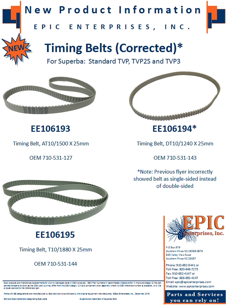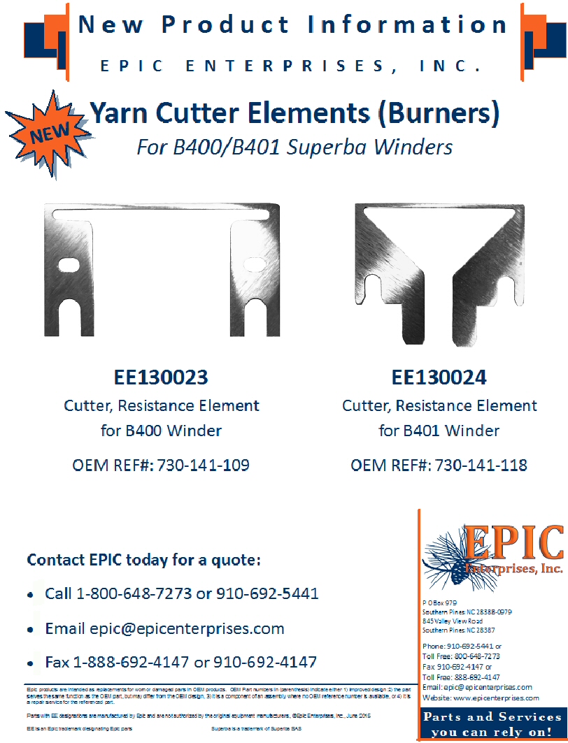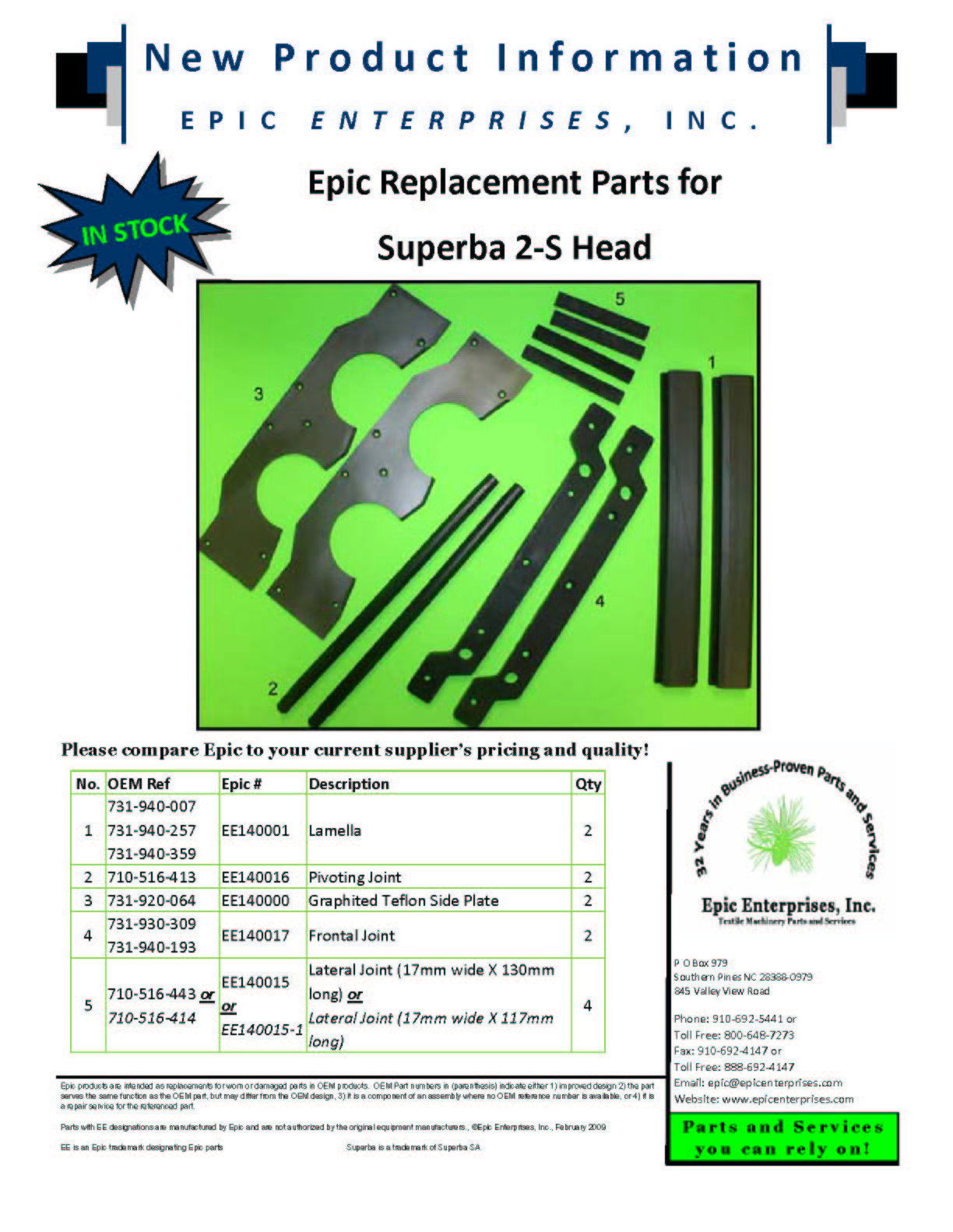 Volkmann is a trademark of Saurer AG. Verdol/ICBT is a trademark of Reyes Group, Superba is a trademark of Superba SAS, Suessen is a trademark of Spindelfabrik Suessen, Schurr, Stahlecker & Grill GmbH. Belmont is a trademark of Belmont Textile Machinery., Murata is a trademark of Murata Machinery, Ltd. YiChang is a trademark of Jingwei Textile Machinery Co., Ltd. Epic is not affiliated with these companies.