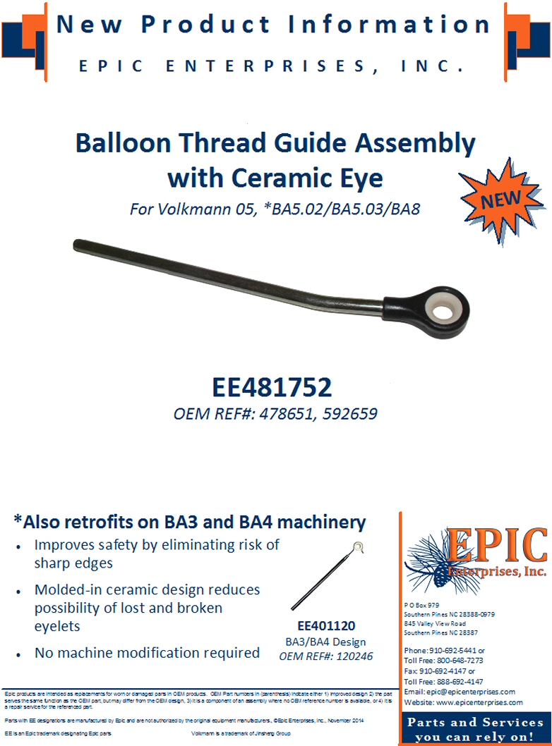 Volkmann is a trademark of Saurer AG. Verdol/ICBT is a trademark of Reyes Group, Superba is a trademark of Superba SAS, Suessen is a trademark of Spindelfabrik Suessen, Schurr, Stahlecker & Grill GmbH. Belmont is a trademark of Belmont Textile Machinery., Murata is a trademark of Murata Machinery, Ltd. YiChang is a trademark of Jingwei Textile Machinery Co., Ltd. Epic is not affiliated with these companies.